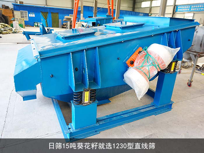 1230型直线筛(3000mm宽x1200mm长),配套2x1.1kw的振动电机;日(八小时)筛分产量大约在10-20吨左右,配套使用0.028 — 5mm的筛网也能轻易完成葵花籽的过网。详细参数如下:
