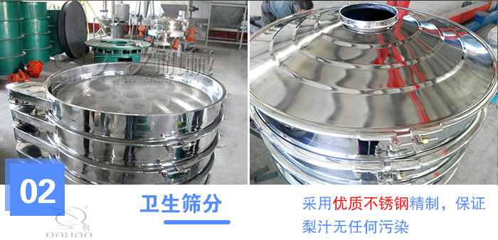 不锈钢妖精视频网站入口的筛分精度非常高,细可达0.028mm(500目),适用于各种液体和超微细粉末的筛分,可以保证梨汁的精准筛分、过滤、除杂,同时筛网可以安装1-5层,筛分出六种不同粒度规格的的梨汁,保证了梨汁的口感,能够适用于客户不同的需求,功能非常强大。